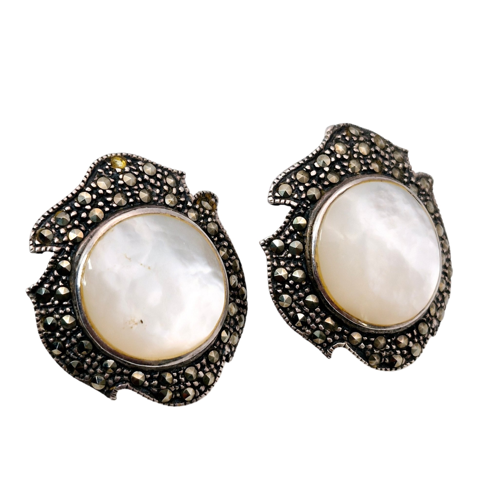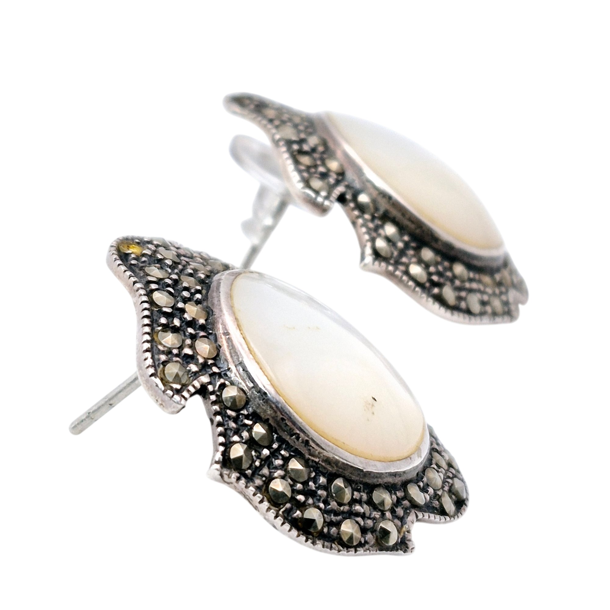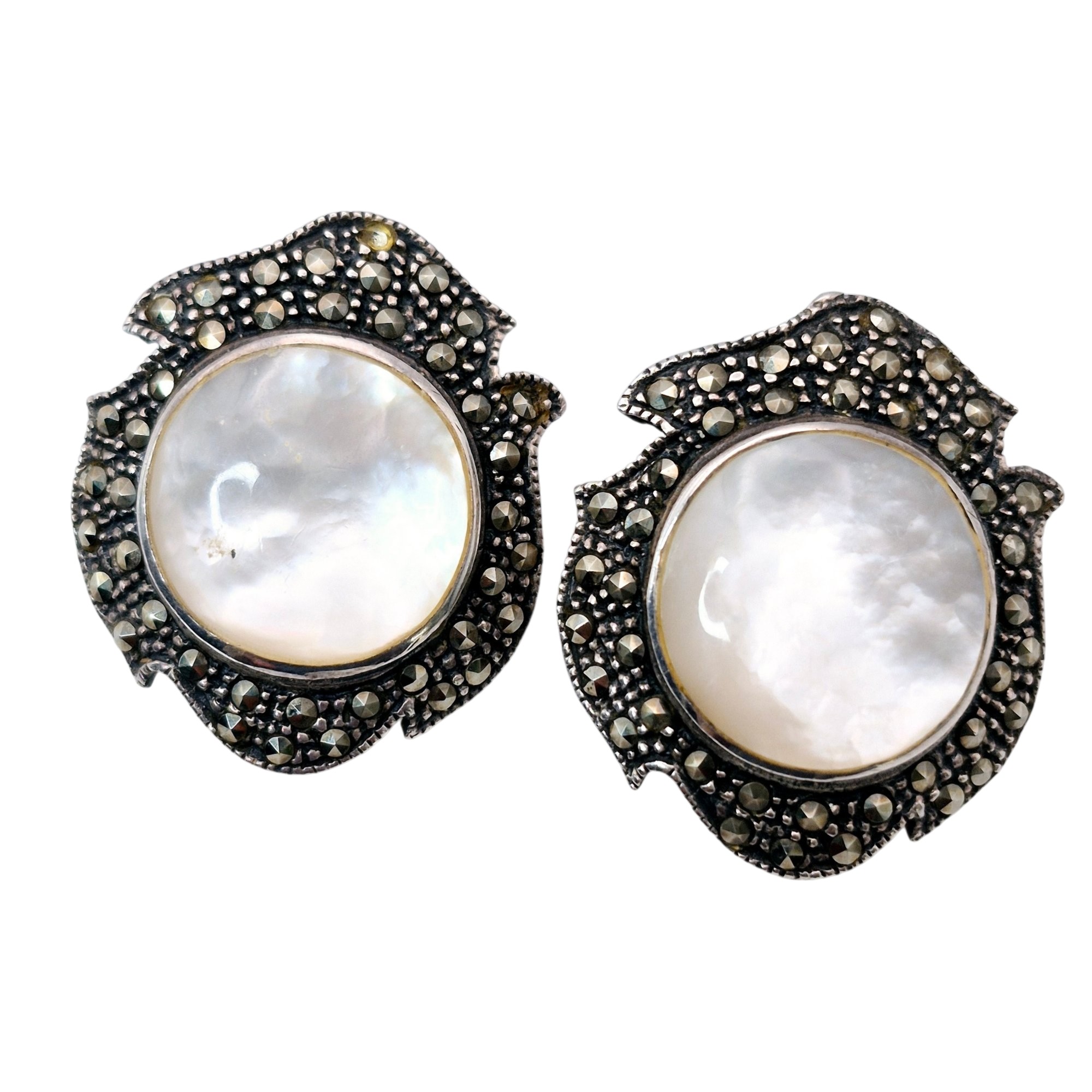 Signed Sterling mother of pearl marcasite stud earrings 10.1 G