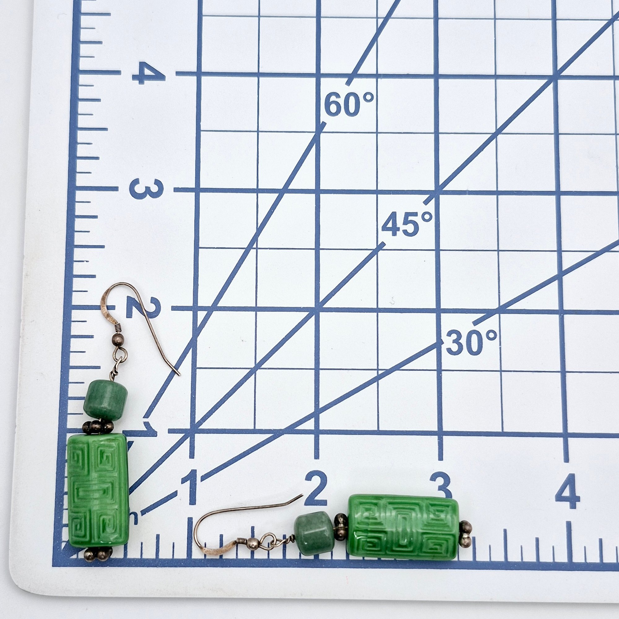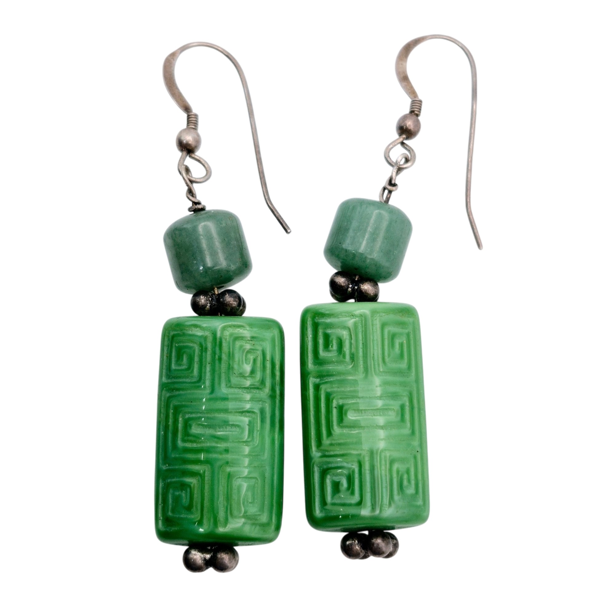Sterling jade carved green stone dangle earrings 11.3 G