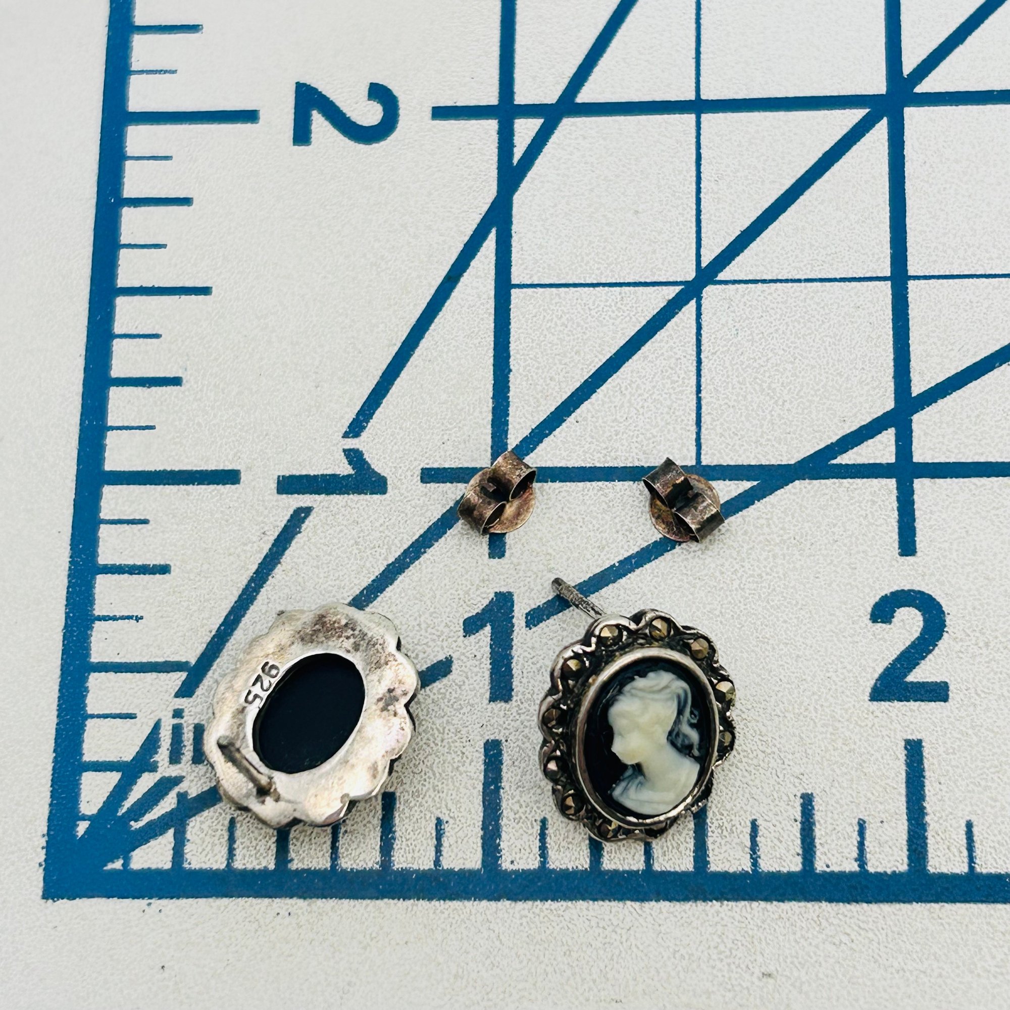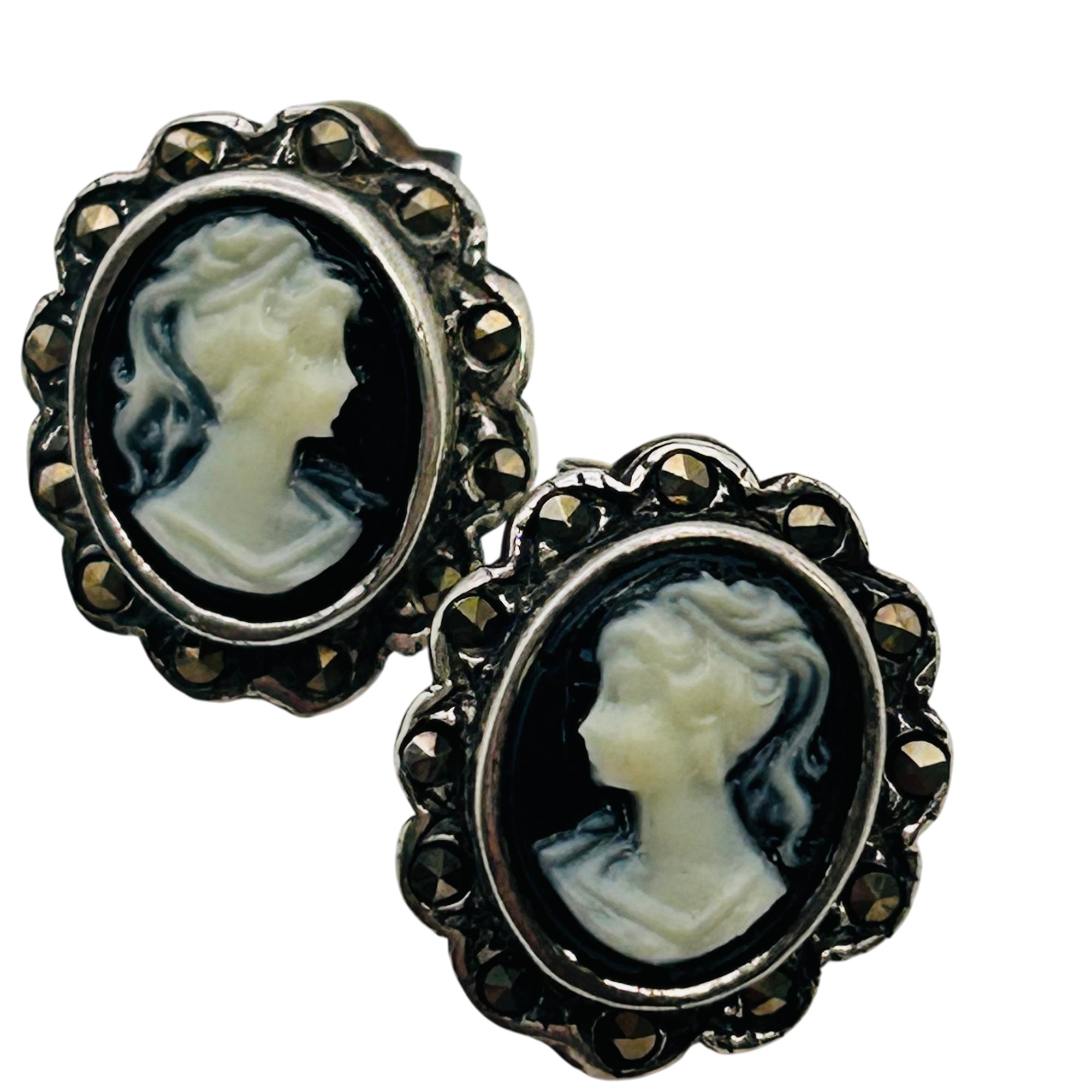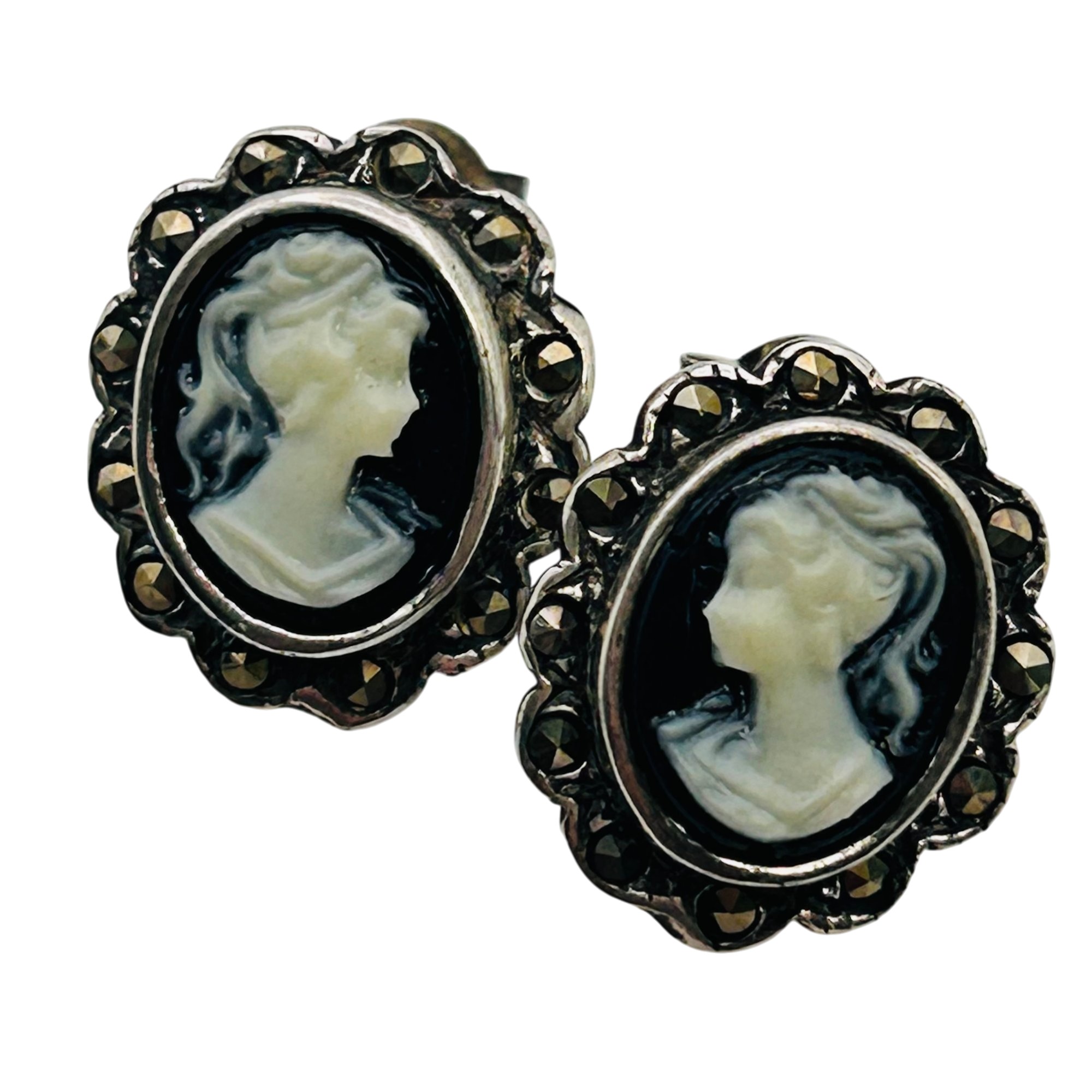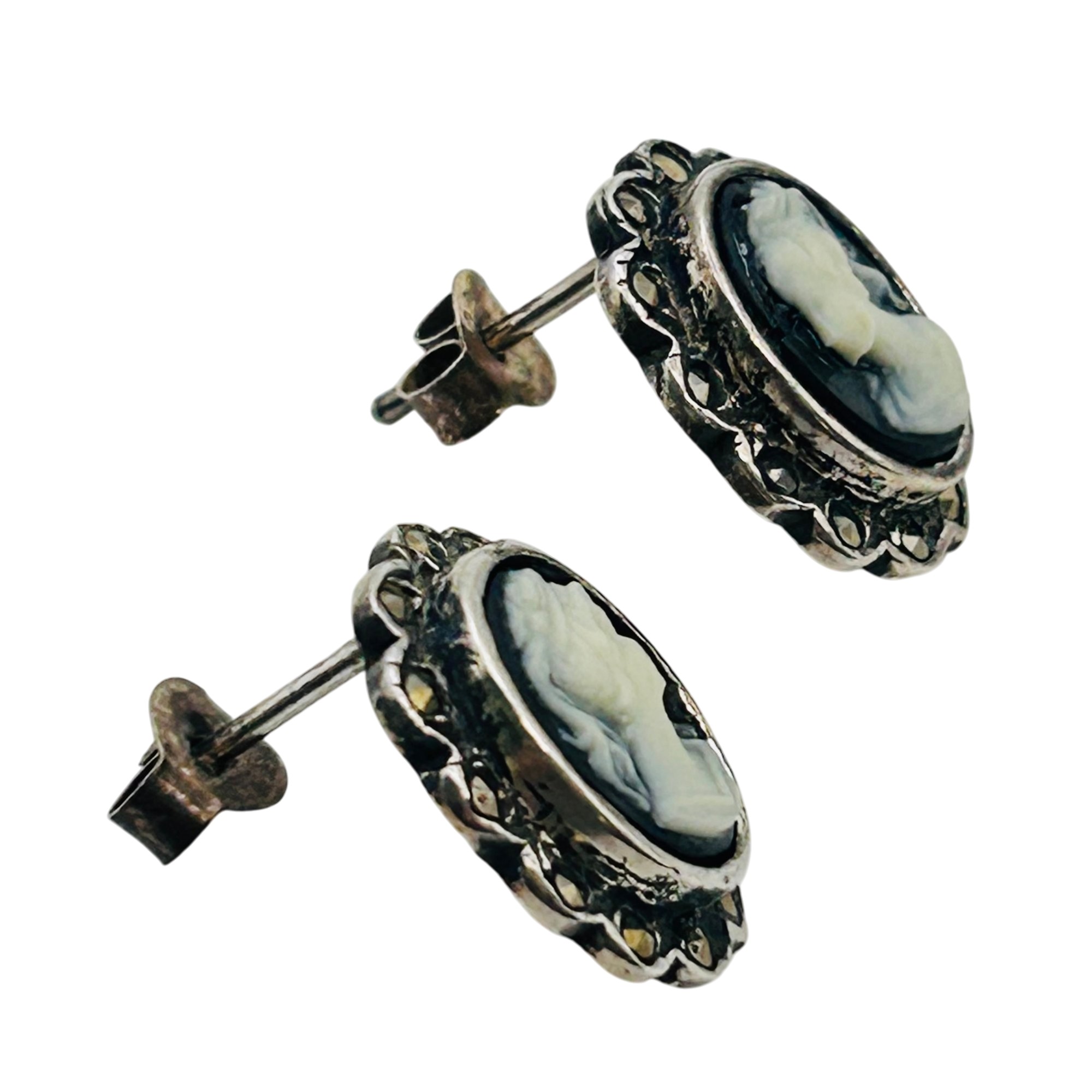 MARCASITE carved cameo Sterling stud earrings 3.64 g