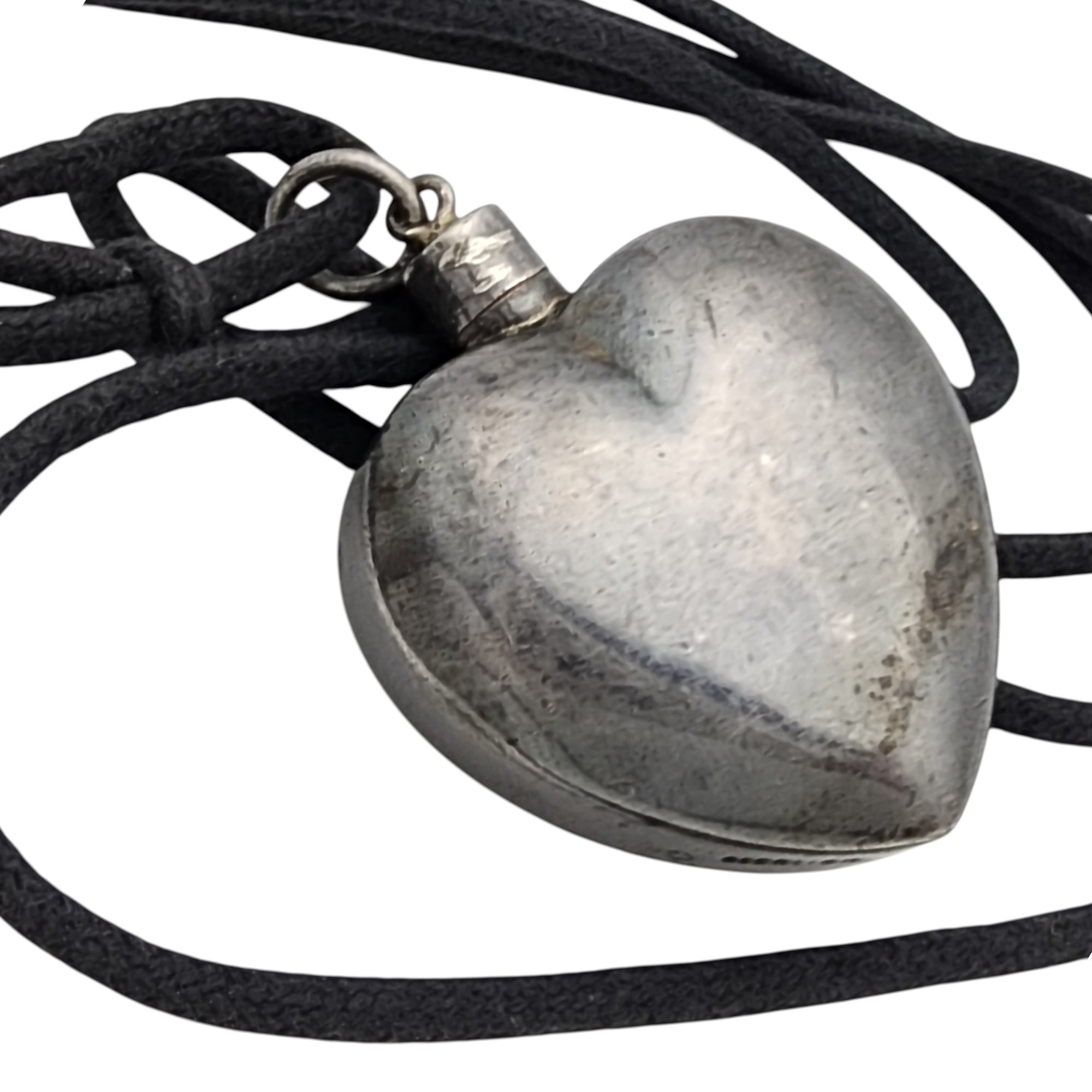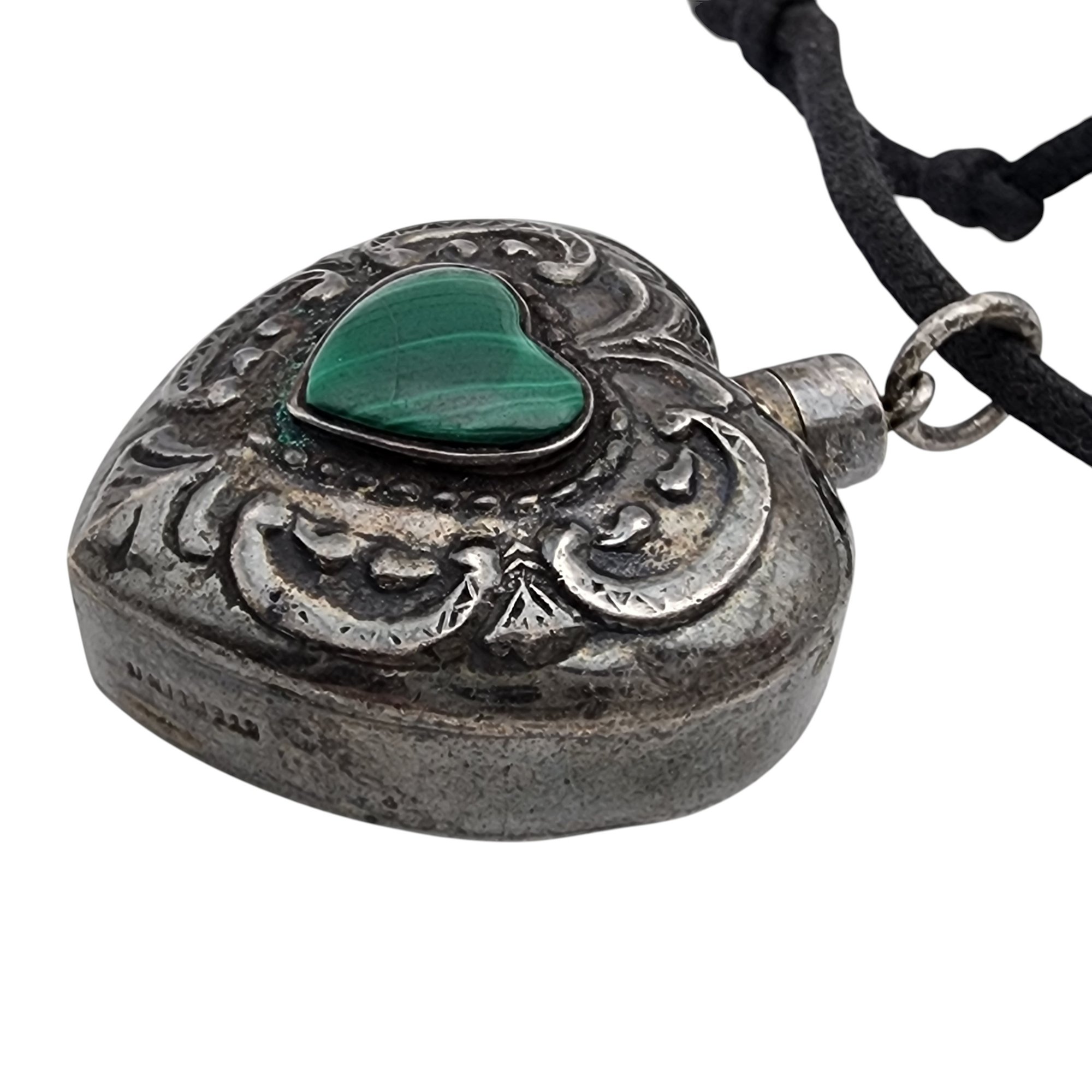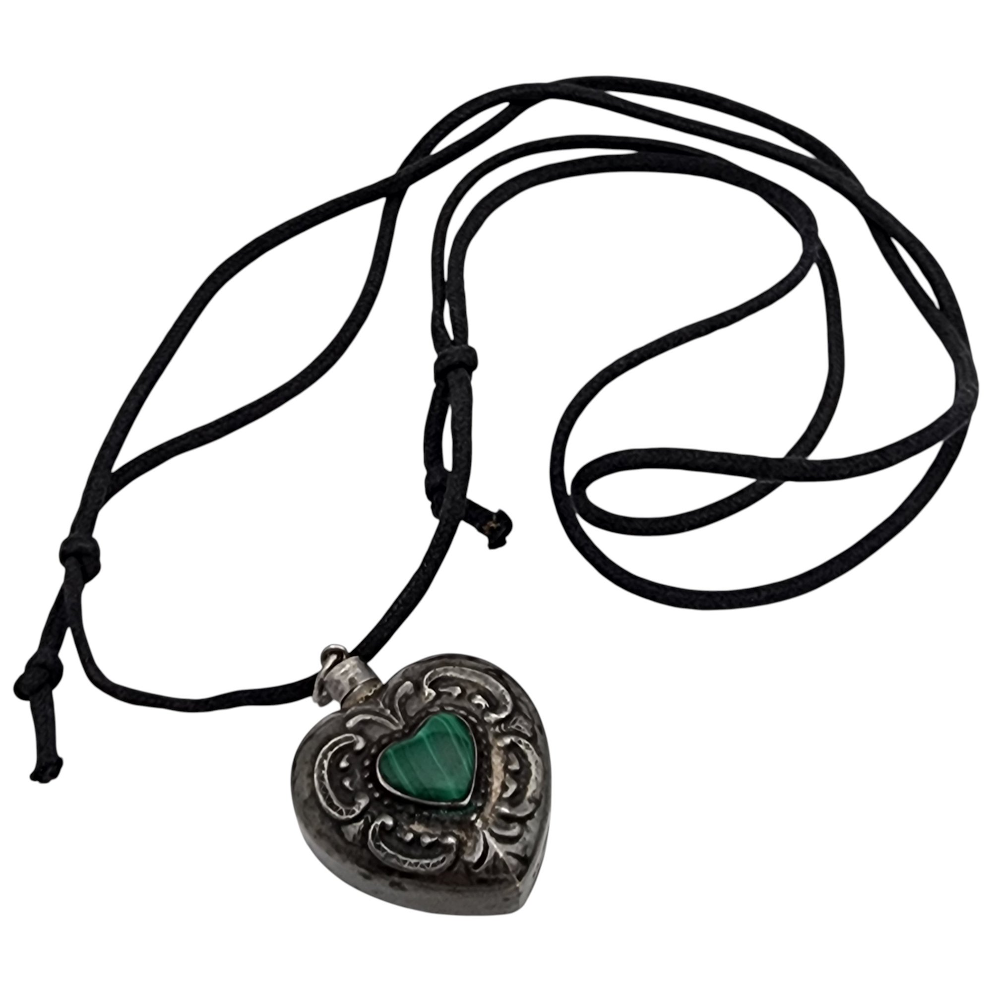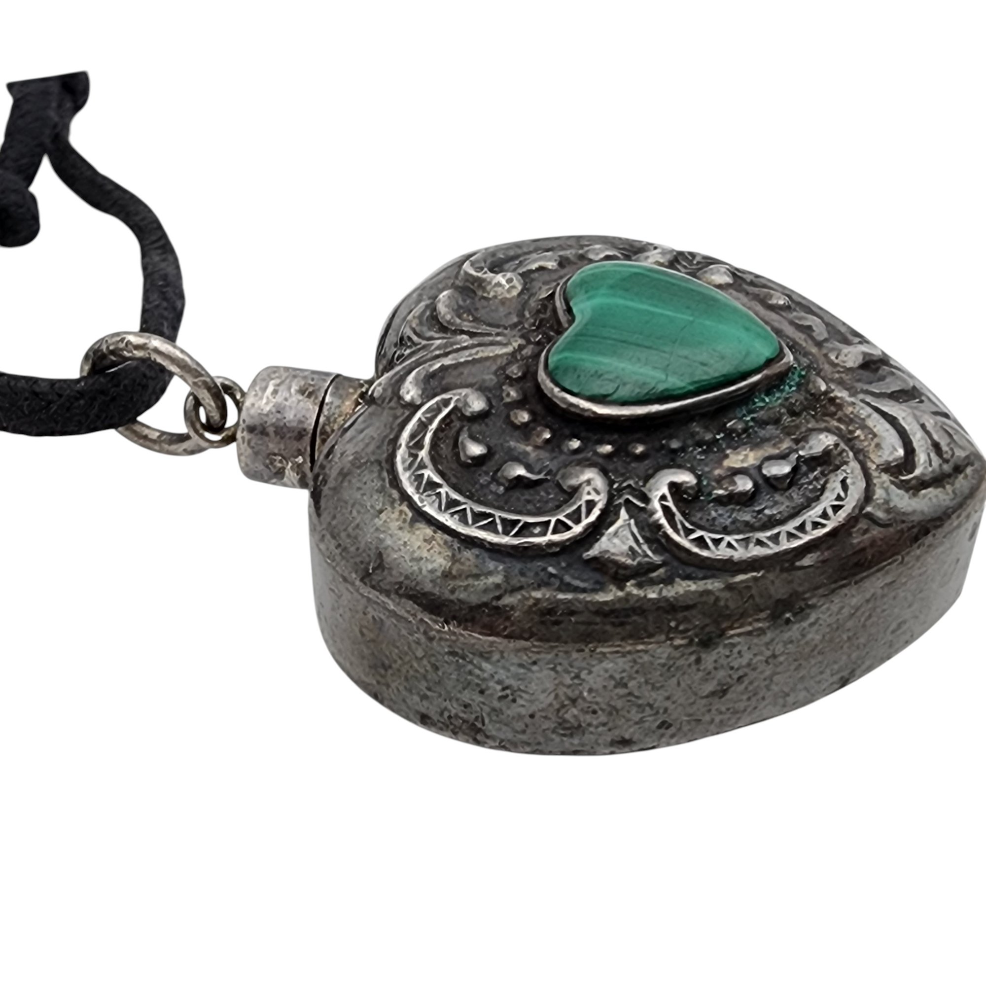 Vintage Sterling Malachite Repousse Heart Necklace – 12.2g (weight of the sterling pendant only, not the black cord) – (there is a seam that makes it look like the pendant top may twist open and be a “bottle” but unable to get it open by hand)