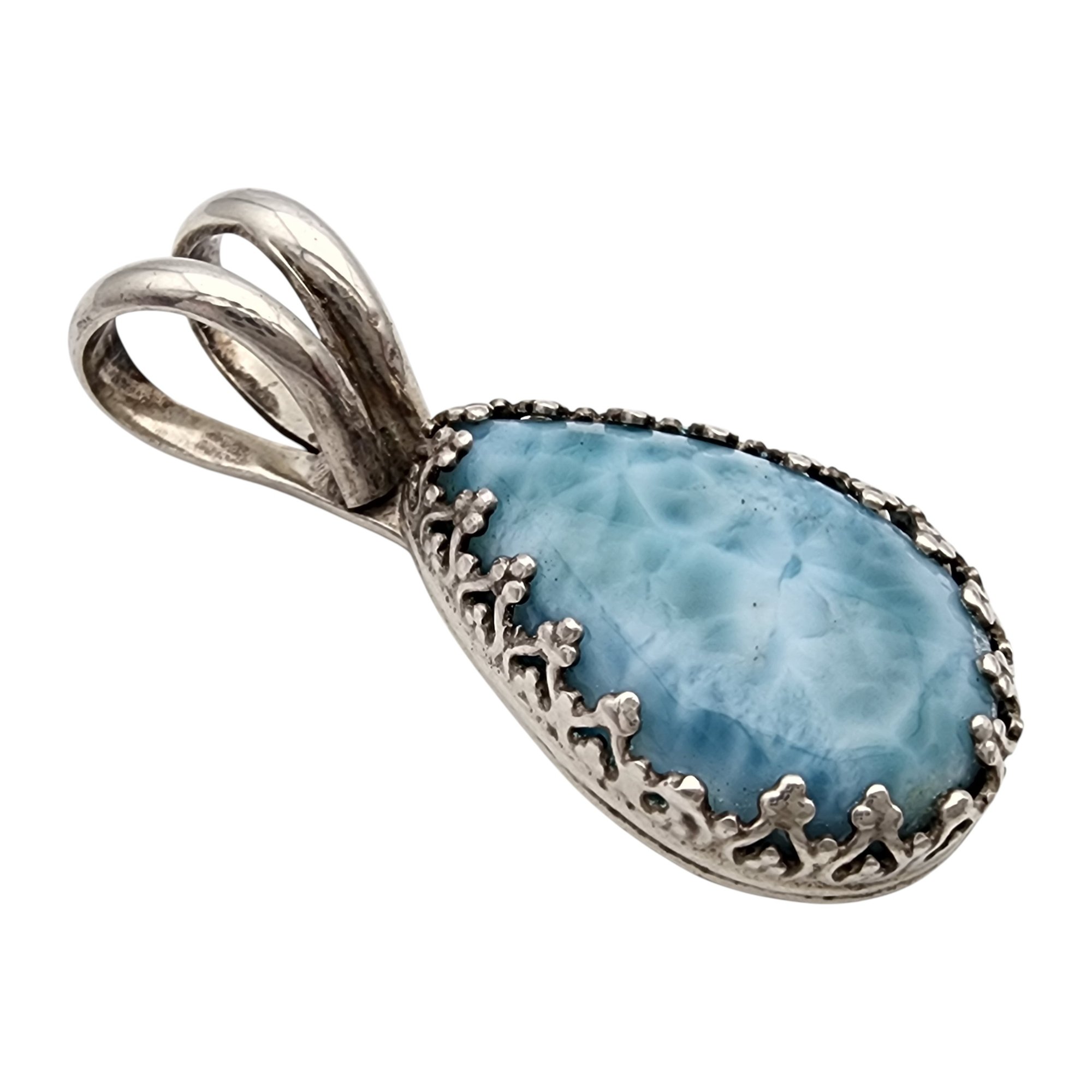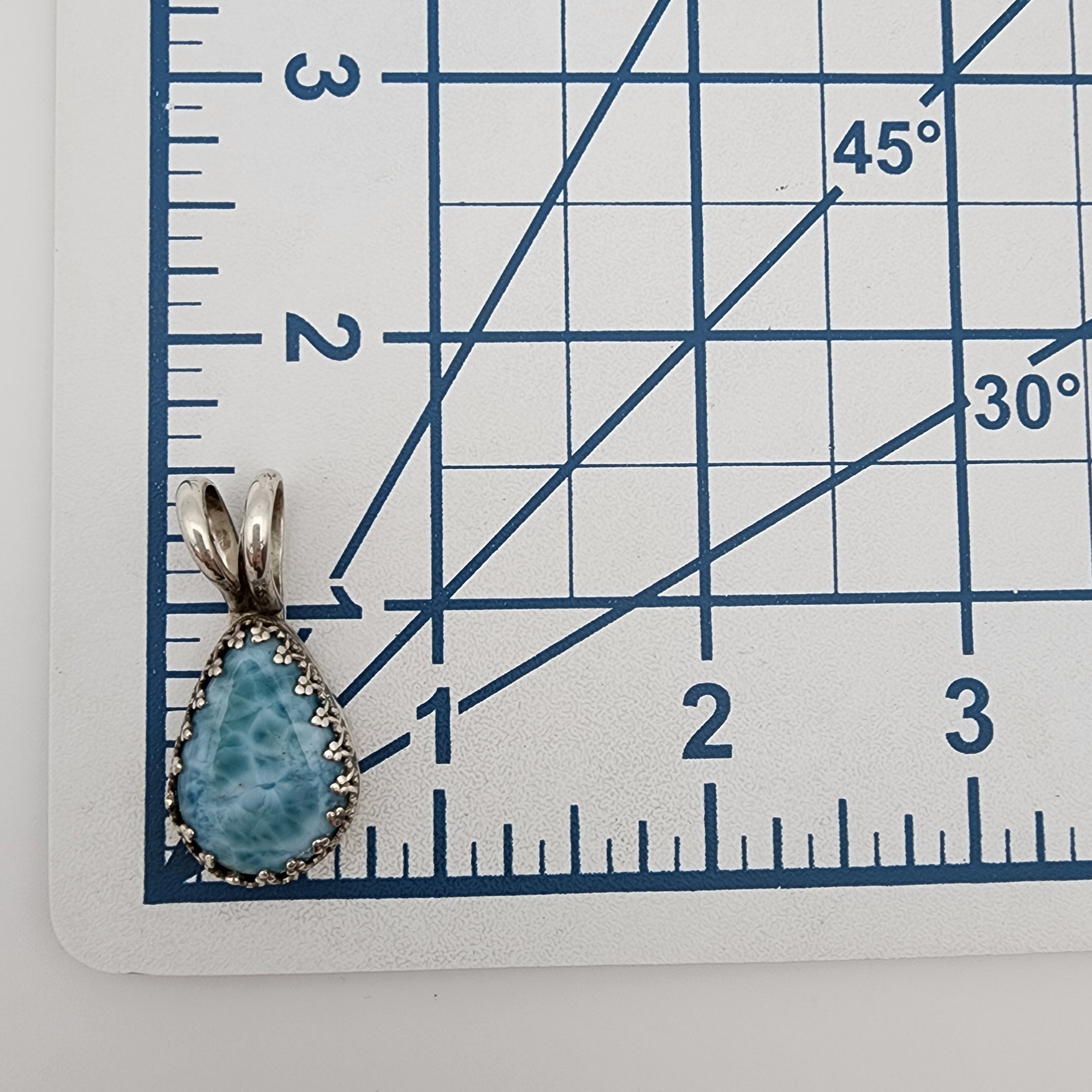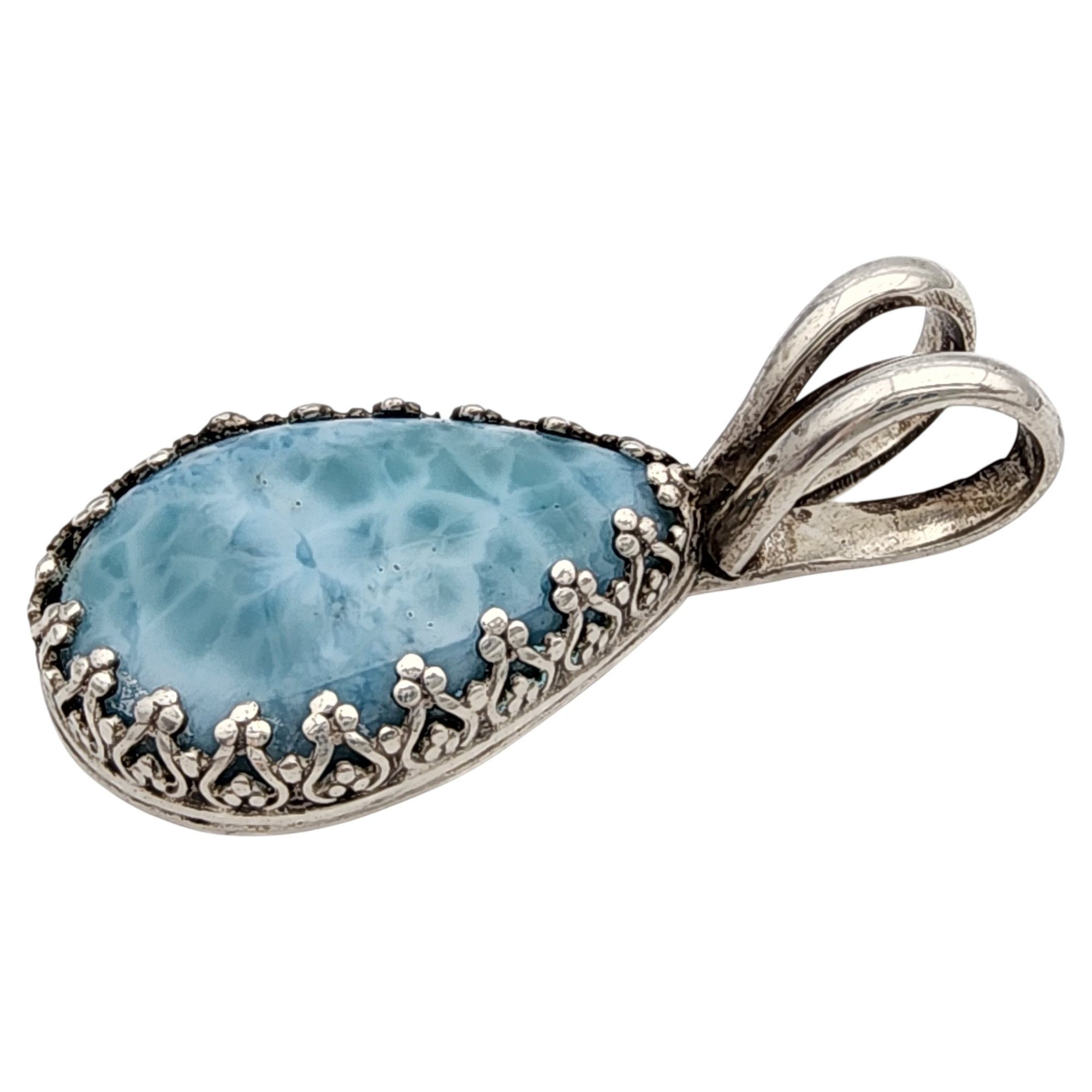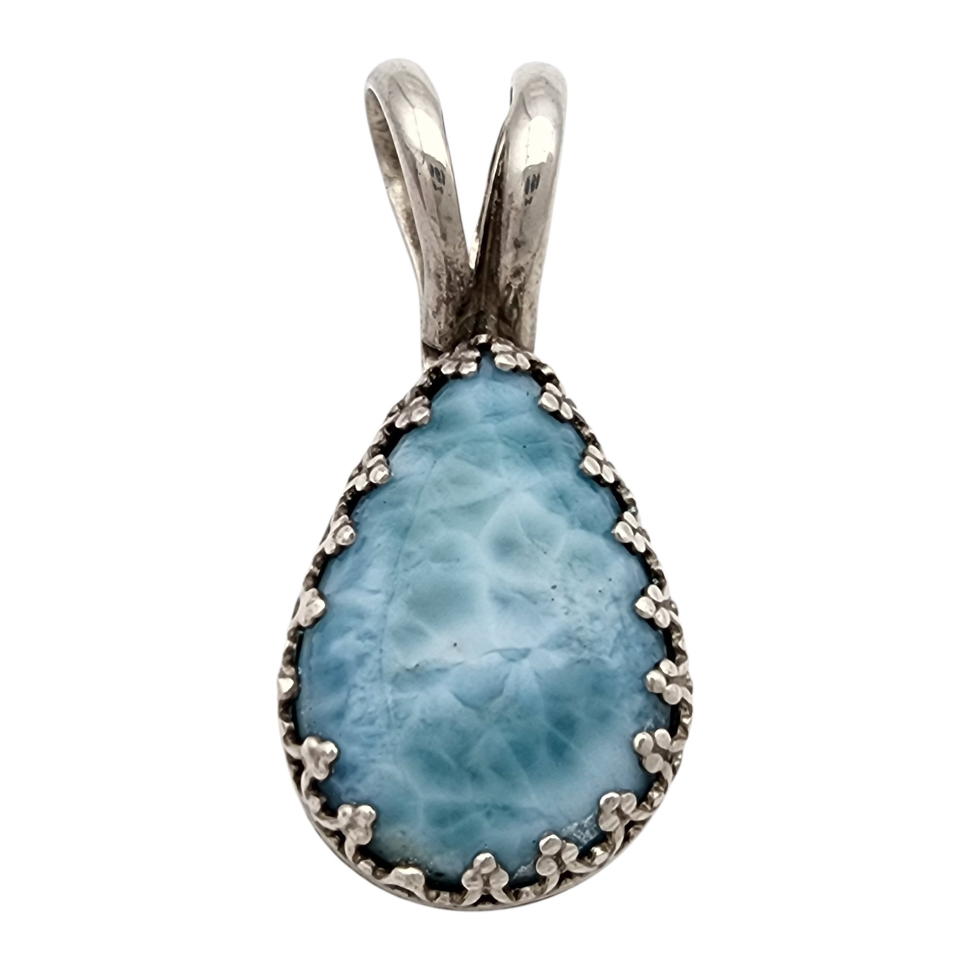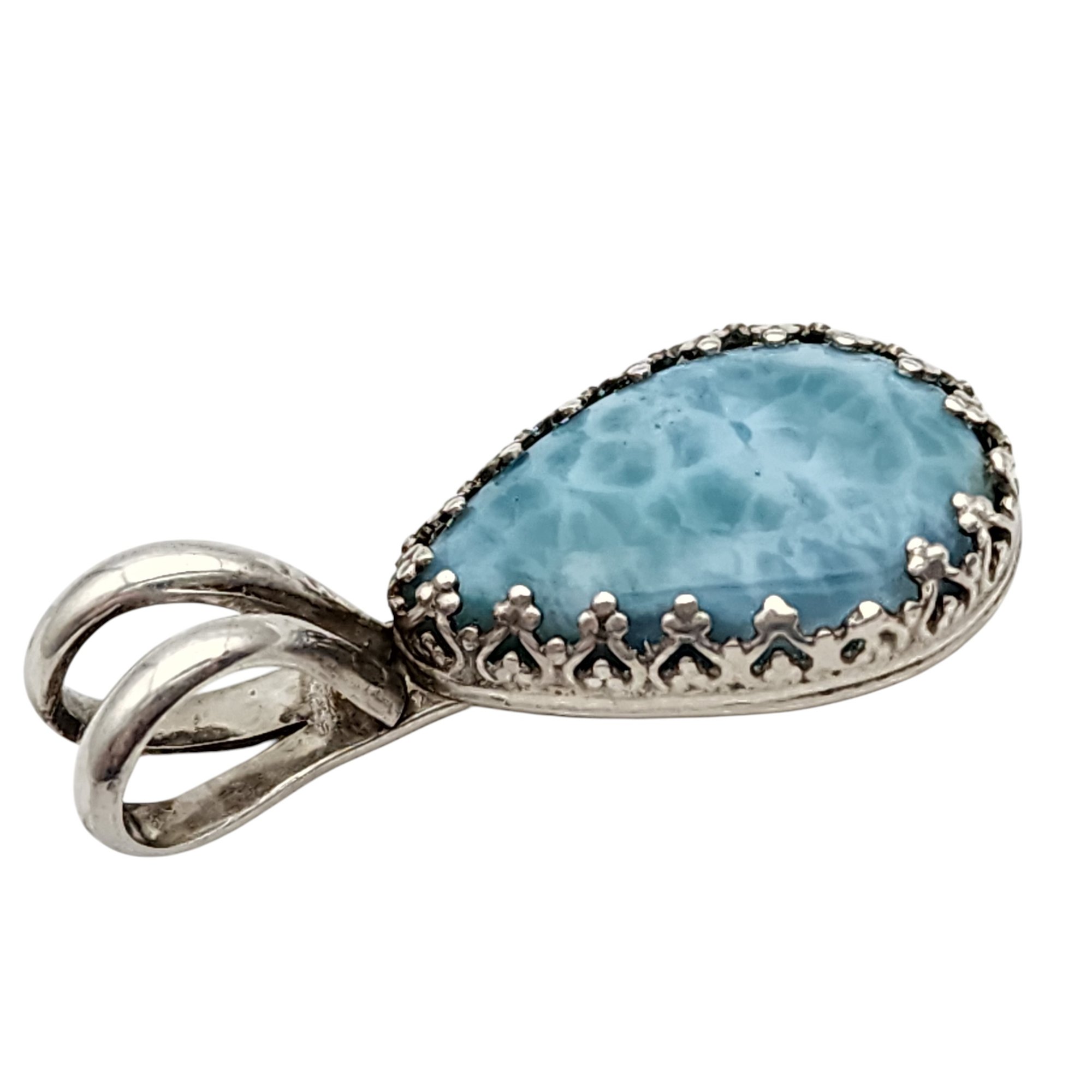 Sterling Larimar Pendant 7.5g – 2 bezel decorative pieces missing, stone is secure and intact.