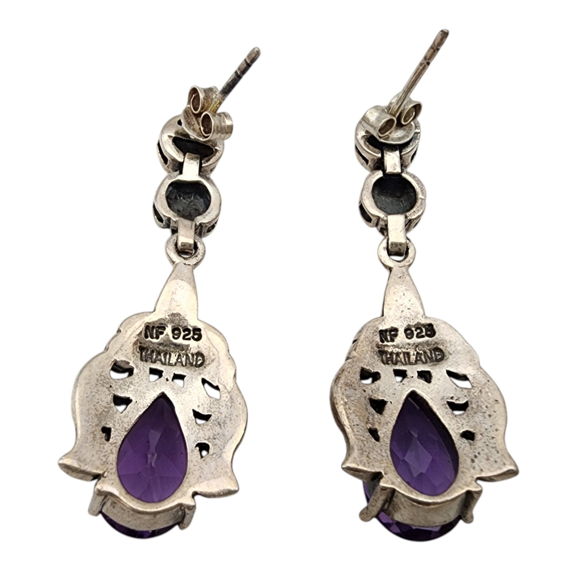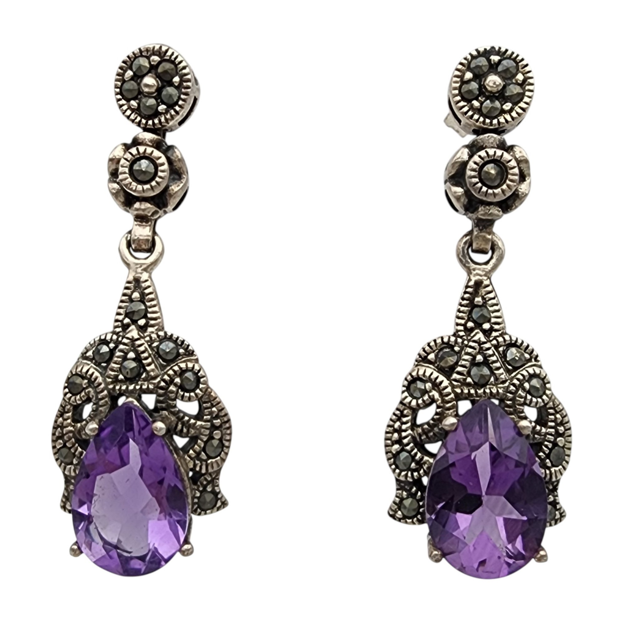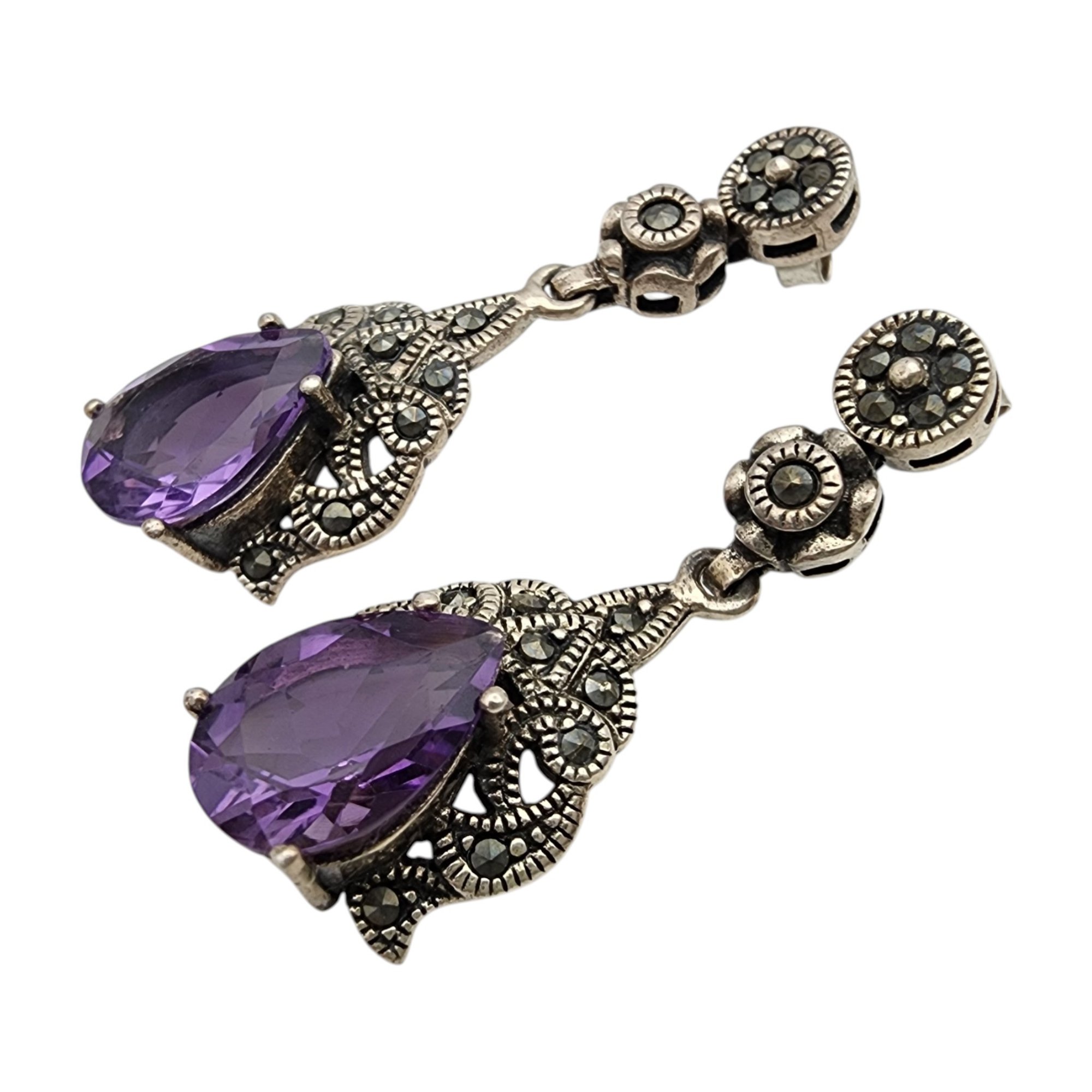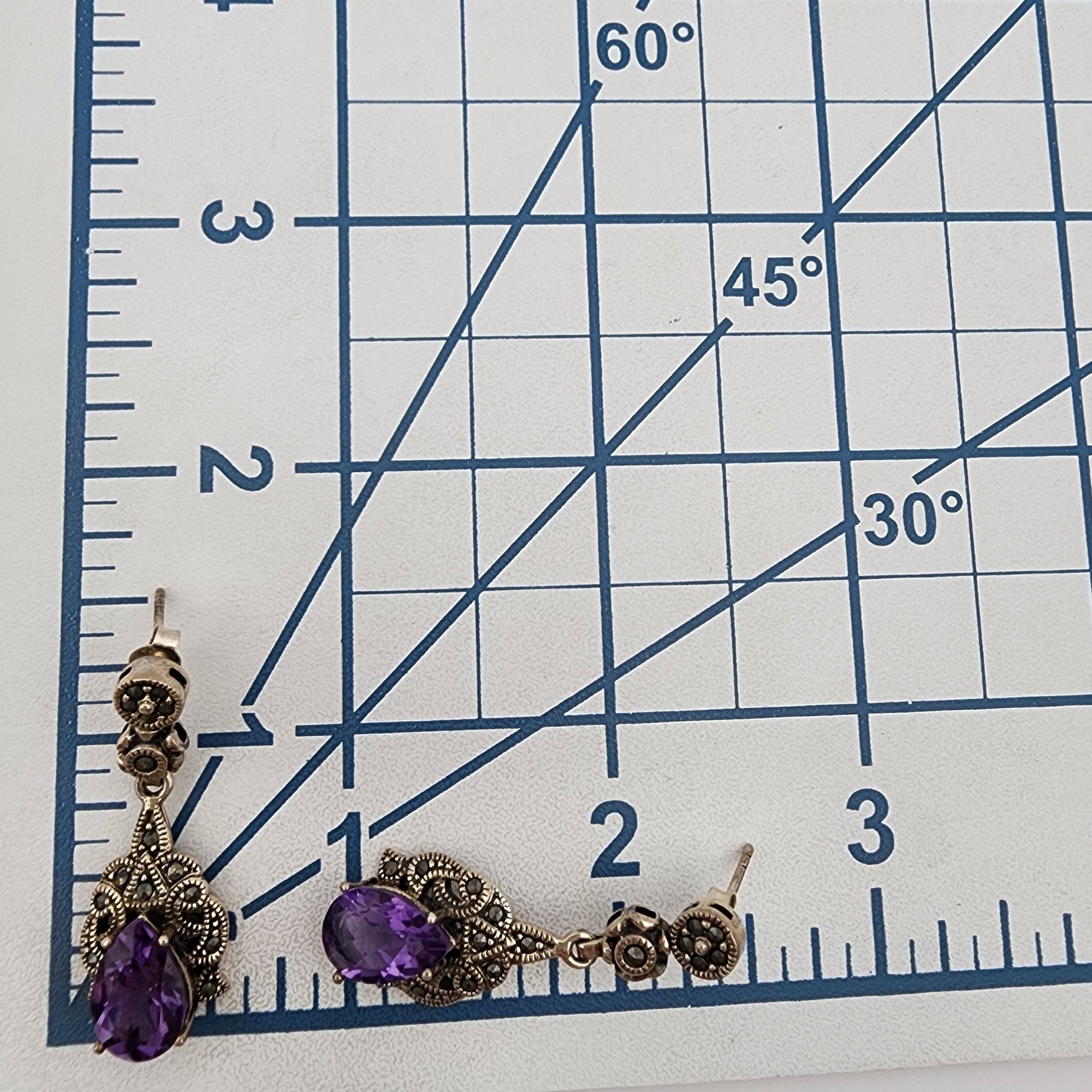 Sterling Amethyst Marcasite Dangle Earrings 9.1g