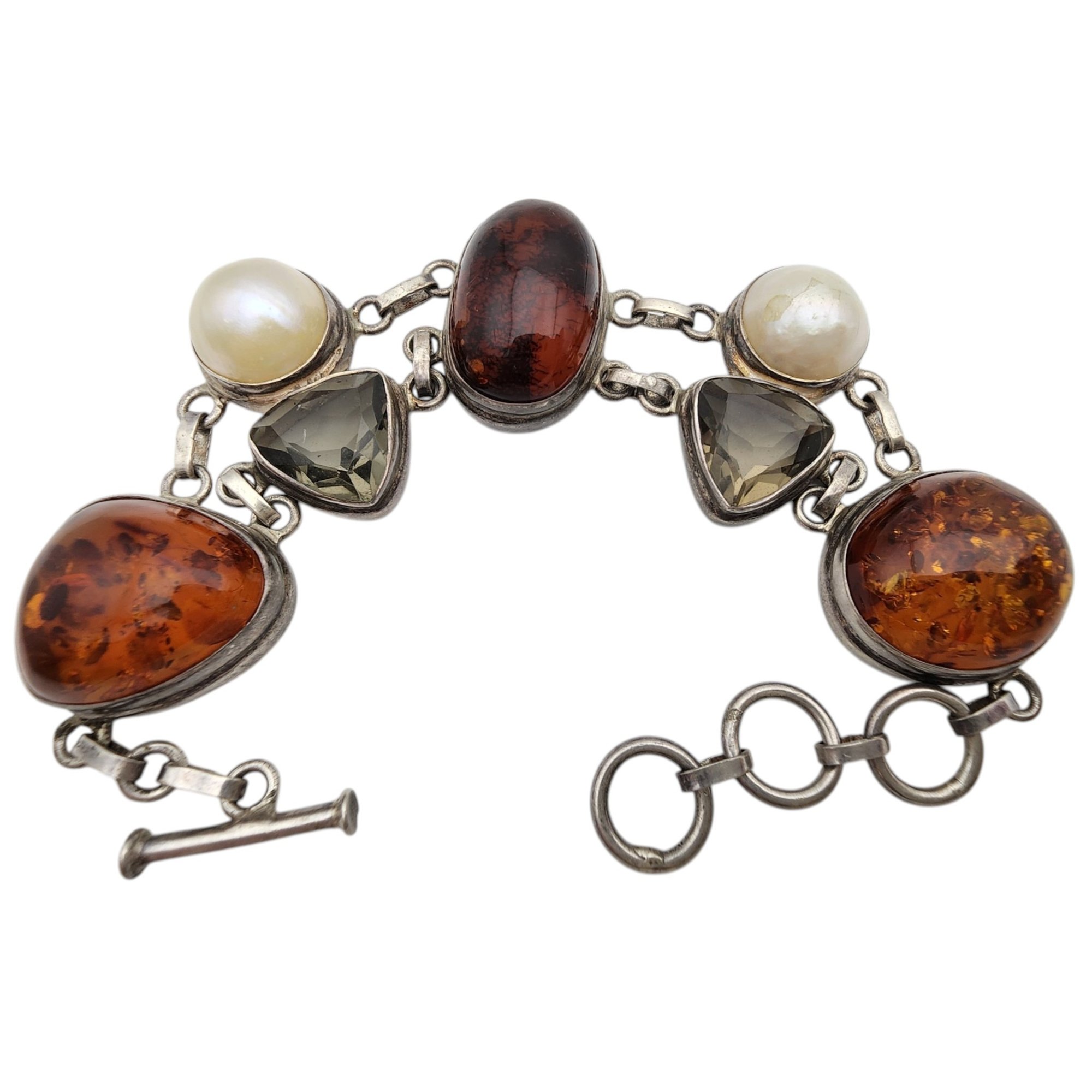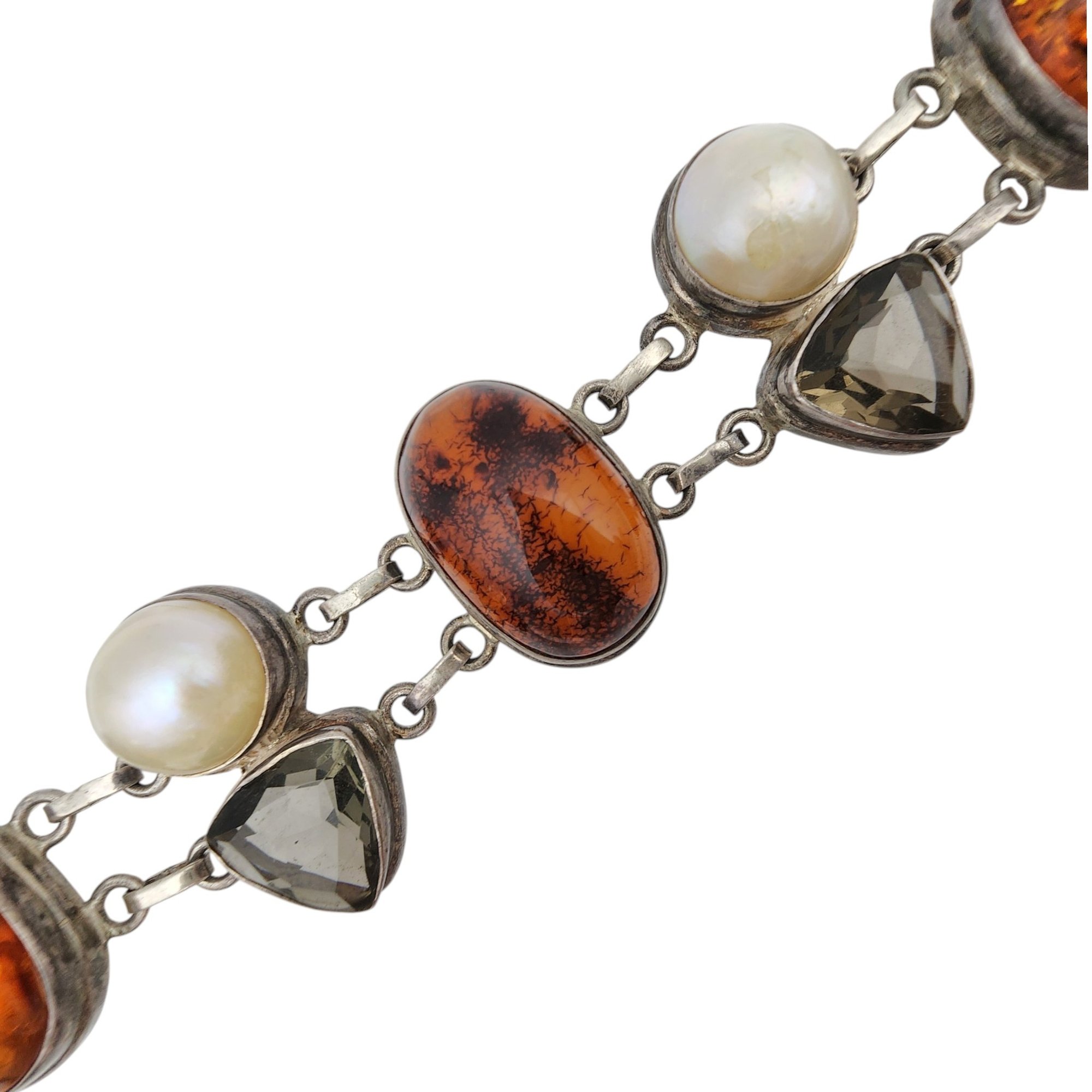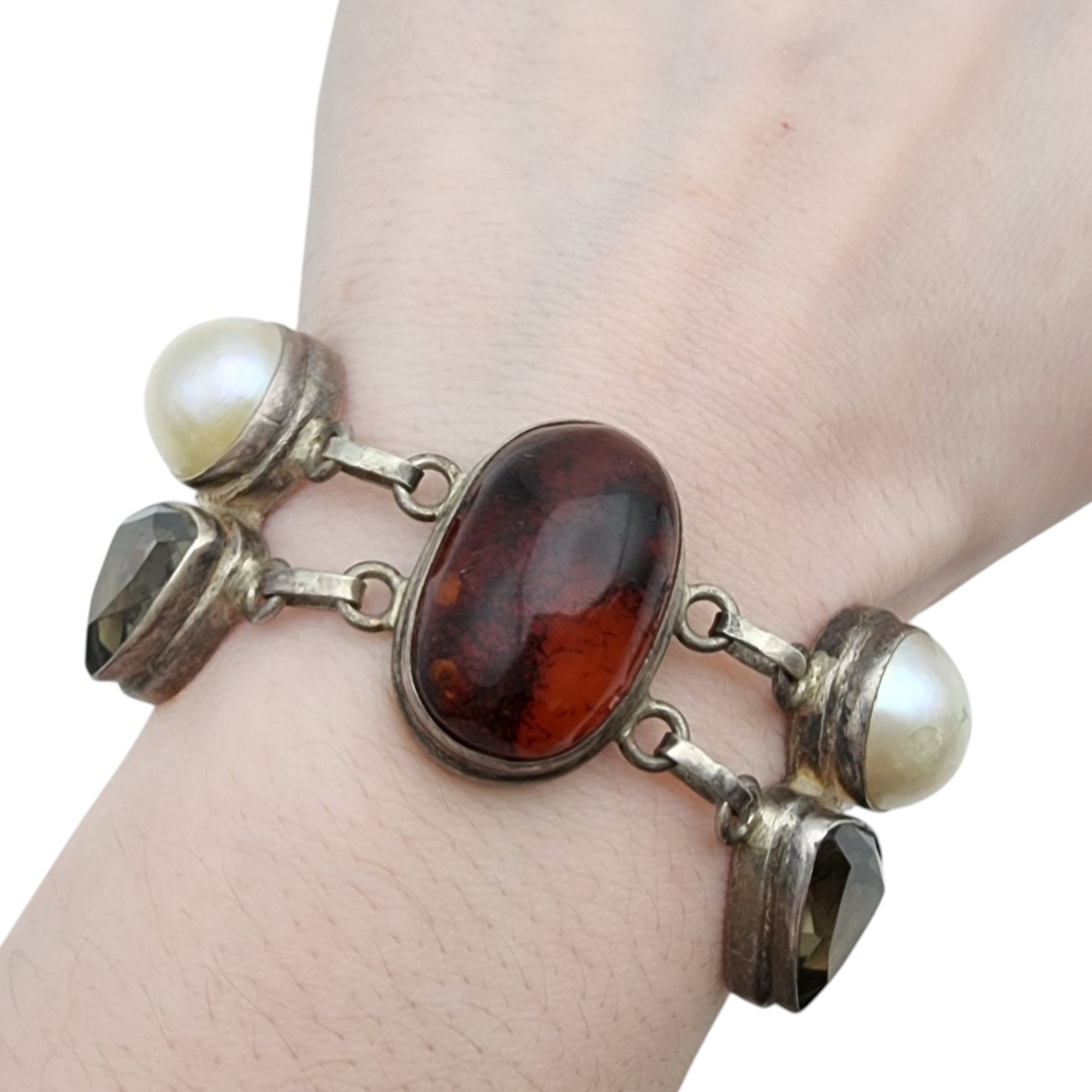 Gorgeous Sterling Amber, Pearl, Smoky Quartz Cluster Bracelet – 40.9g – some surface wear, light scratches present on the stones/pearl