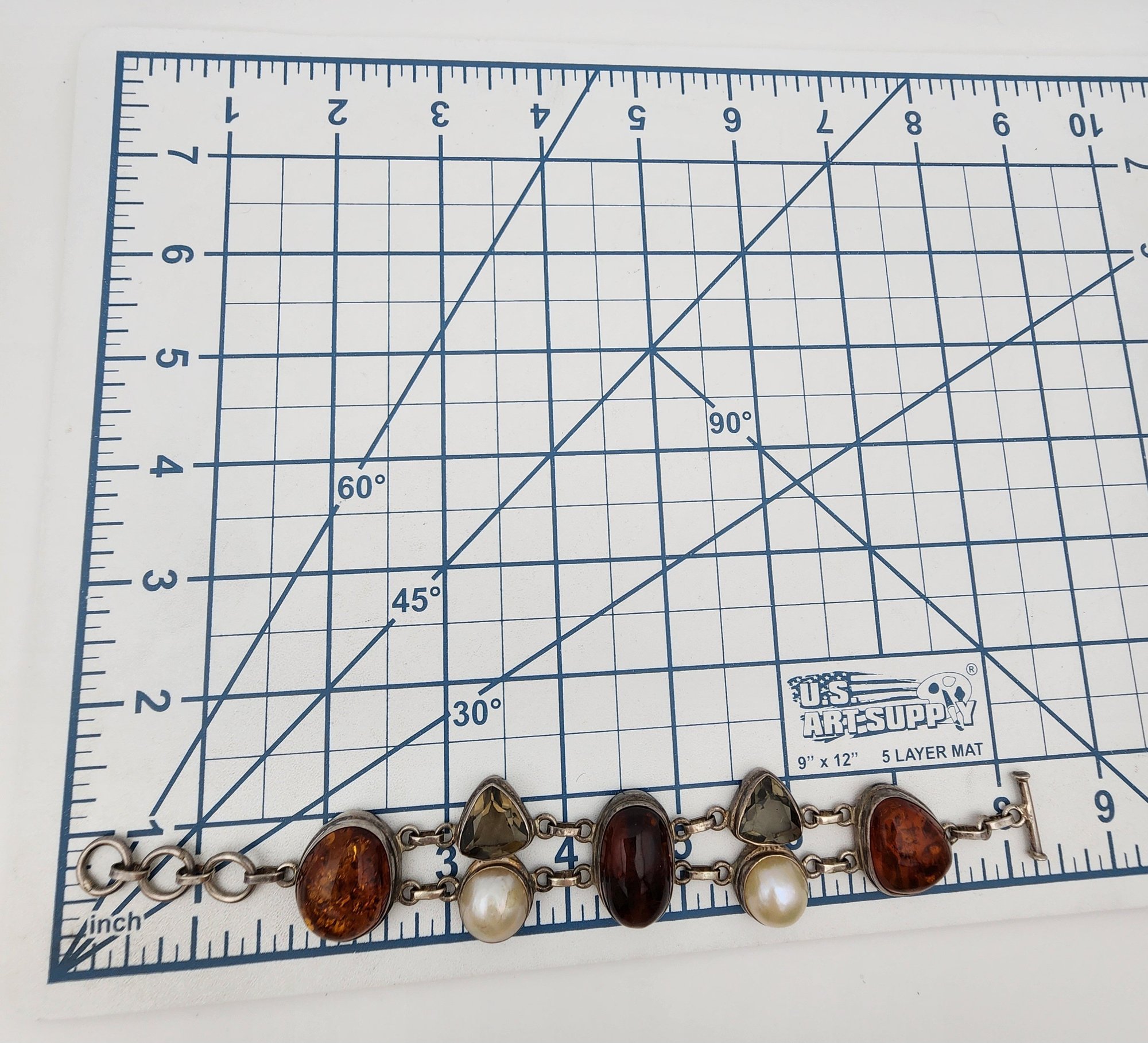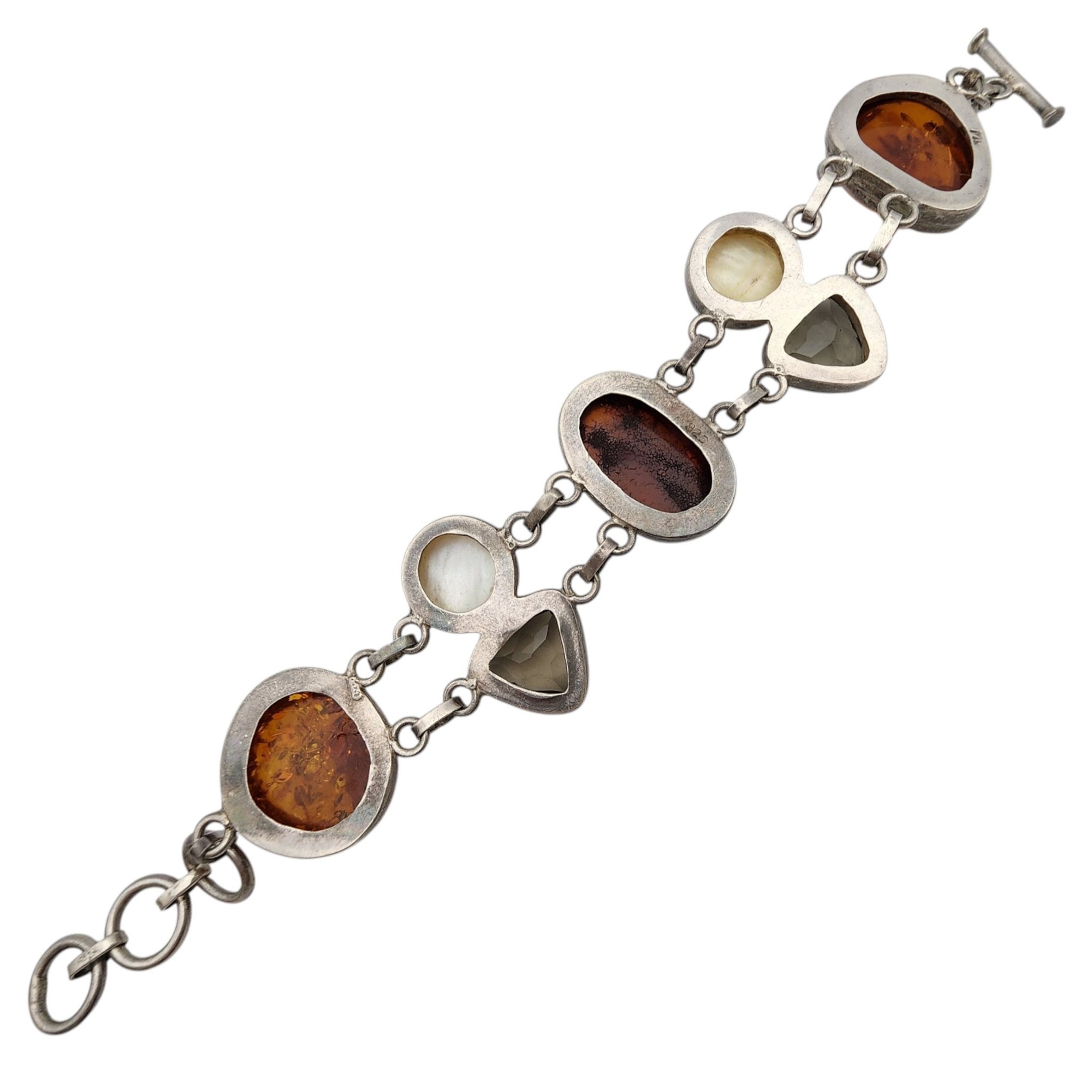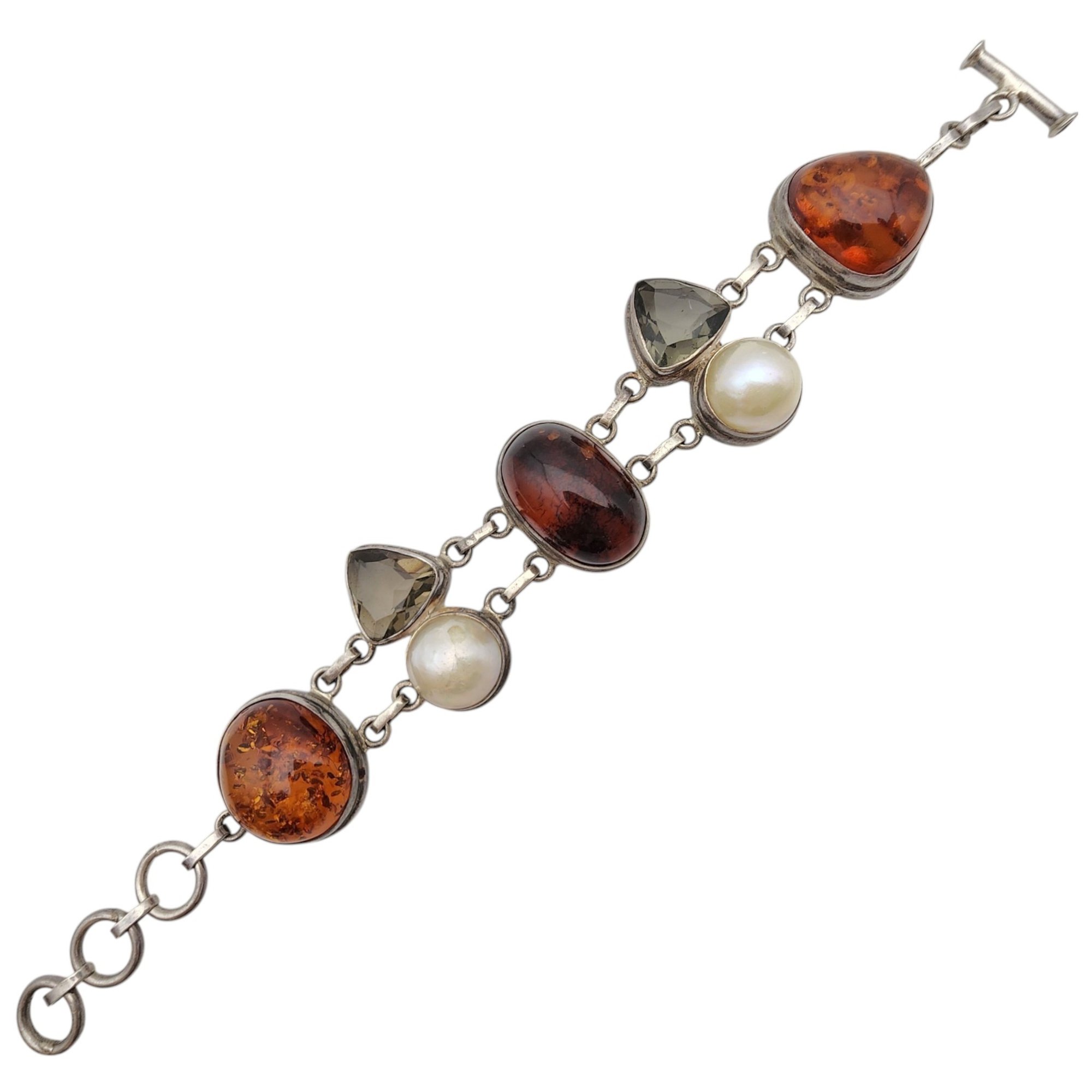 Gorgeous Sterling Amber, Pearl, Smoky Quartz Cluster Bracelet – 40.9g – some surface wear, light scratches present on the stones/pearl